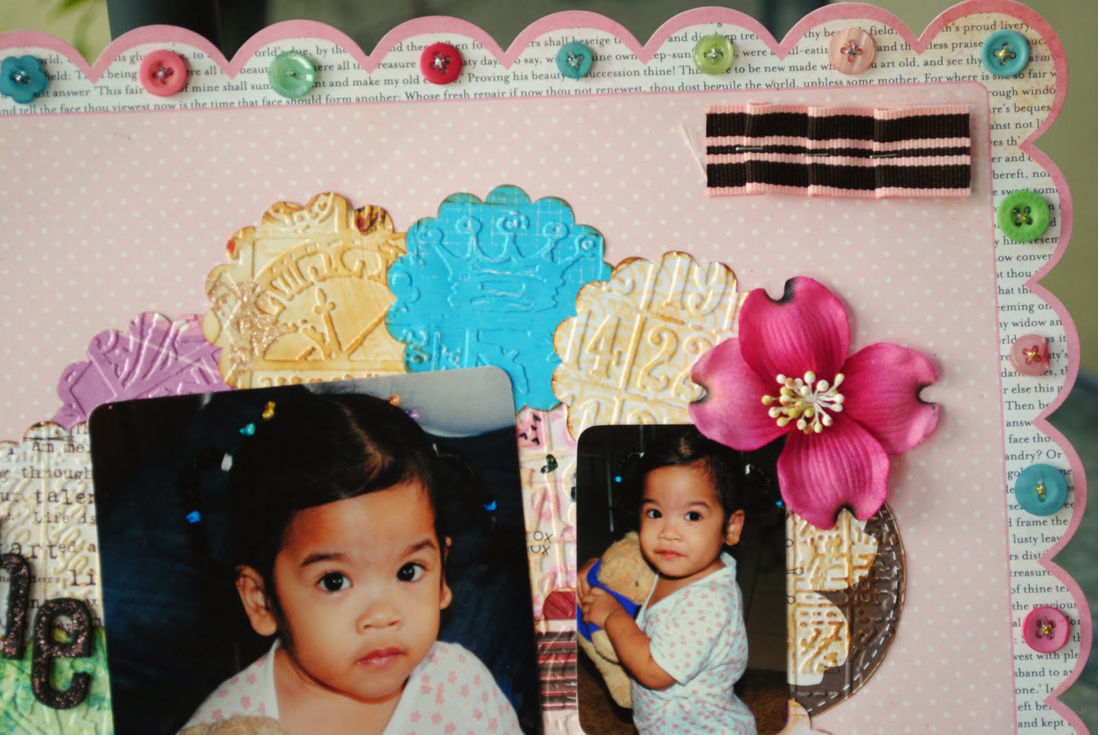 Material used: The Girls Paperie by Margie patterned paper, 7 Gypsies patterned paper, DCWV The Madly In Love patterned paper, American Crafts thickers, Ribbon from the local scrapbook store, Tim Holtz tiny attacher, Rhonna Farrer buttons (A Rhonna Farrer Christmas Collections Hundreds of Buttons), Prima flower, EK success puncher, Devivan Kindy Glitz, Tim Holtz Distress Ink, Tim Holtz Sizzix embossing folders and corner puncher.